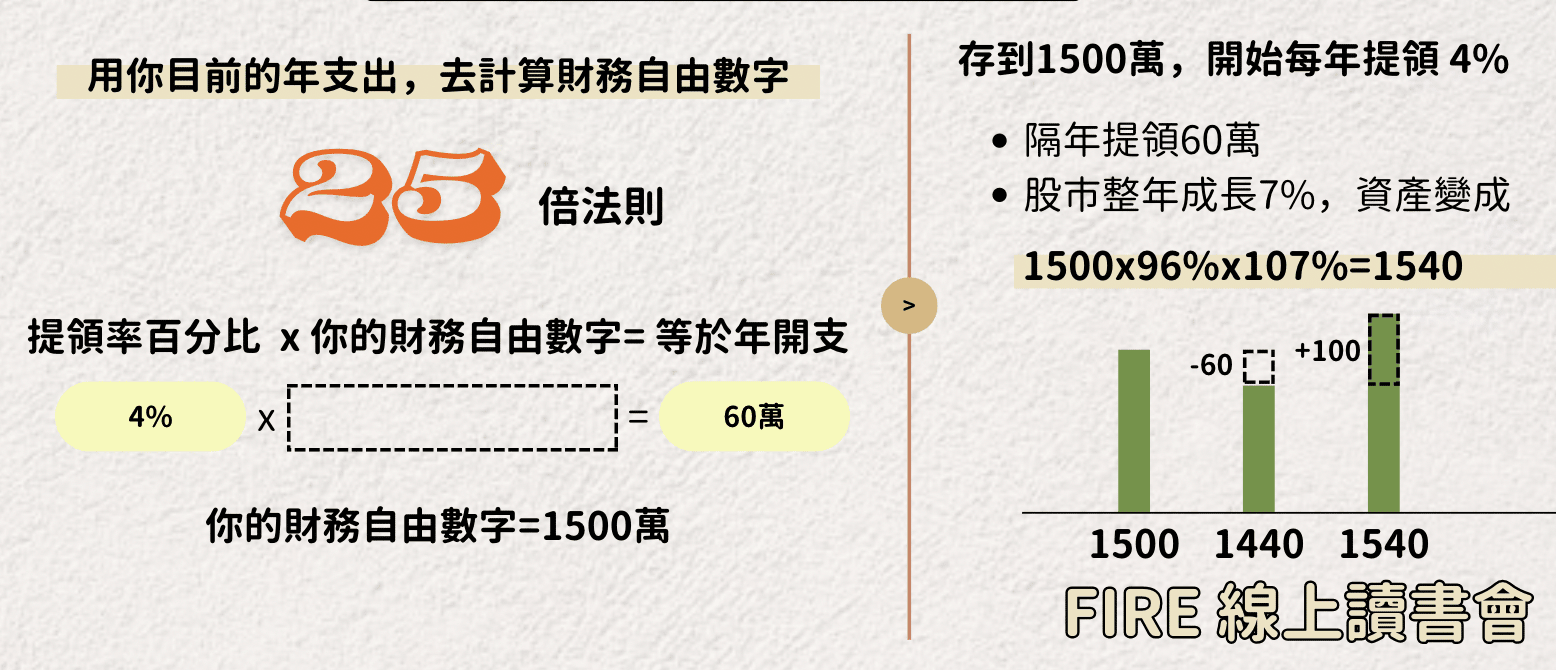 對於我們對於生活及居住地點的要求,都會影響我們的財務自由數字。我們在講座中有提到「25倍法則」這個觀念,我們預估存到財務自由數字後,每年從資金池的提領率是 4%。